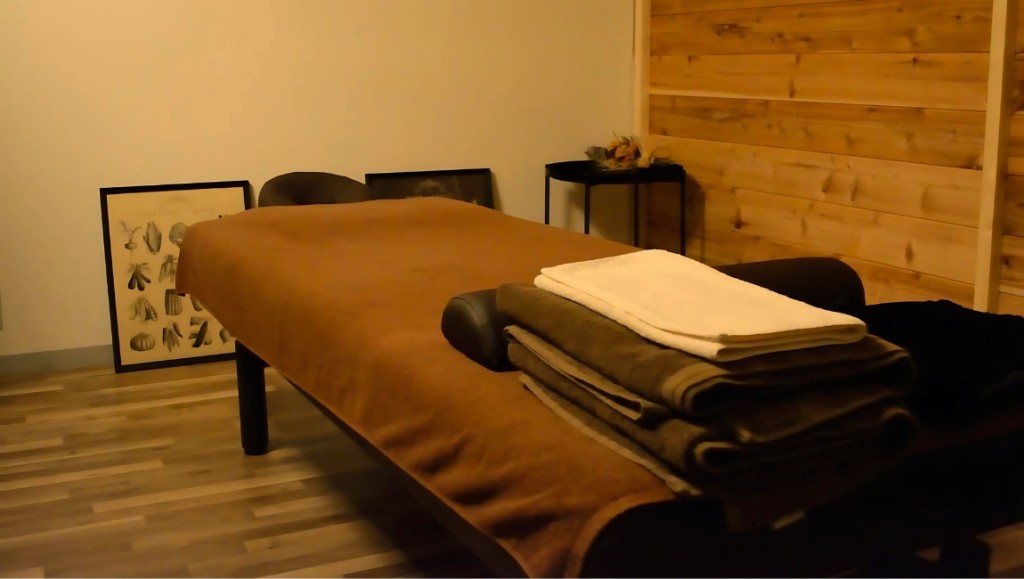 落ち着いた木の仕切りでゆっくり施術を受けられます。